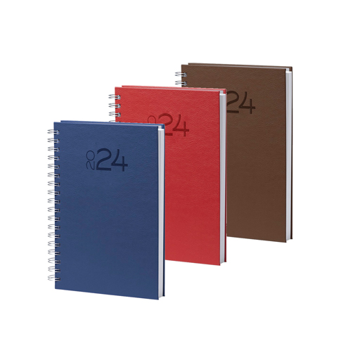 Agenda de anillas tamaño B5, acabada en resistente y suave polipiel de variados colores. Diseño página día con frase del día y páginas con esquina troquelada para marcar el día.. Presentada en caja individual.