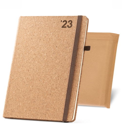 Agenda de formato A5 fabricada en corcho. Con soporte para bolígrafo (bolígrafo no incluido) con unas dimensiones de 148 x 210 mm y vista diaria. Un total de 360 paginas en 4 idiomas (Portugués, Castellano, Inglés y Francés), de los cuales los idiomas principales son el portugués y el castellano. Se suministra en una funda de non-woven (No tejido) de 205 x 250 mm. Indicación descriptiva de los días festivos de Portugal, España y PALOP; indicación de los días festivos internacionales. Mapas a 4 colores (husos horarios, Mundial, Península Ibérica, Europeo, África y Angola). Posibilidad de añadirle un encarte (página en el interior de la agenda) personalizado con su publicidad o información. Consúltenos.