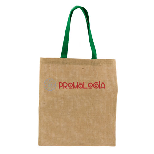 Bolsa publicitaria para personalización en serigrafía, realizada con fibras de yute, de cuerpo marrón y asas medianas a elegir entre color natural y verde. Aspecto muy natural y ecológico.