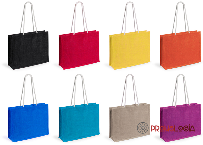 Bolsa para publicidad elegante y natural, fabricada con yute en cuatro colores, rojo, natural, azul y amarillo, Yute, con asas tipo cordón en algodón blanco. Con asas de algodón largas de 70cm en color blanco y reforzadas. De acabado cosido y resistencia hasta 10kg de peso.