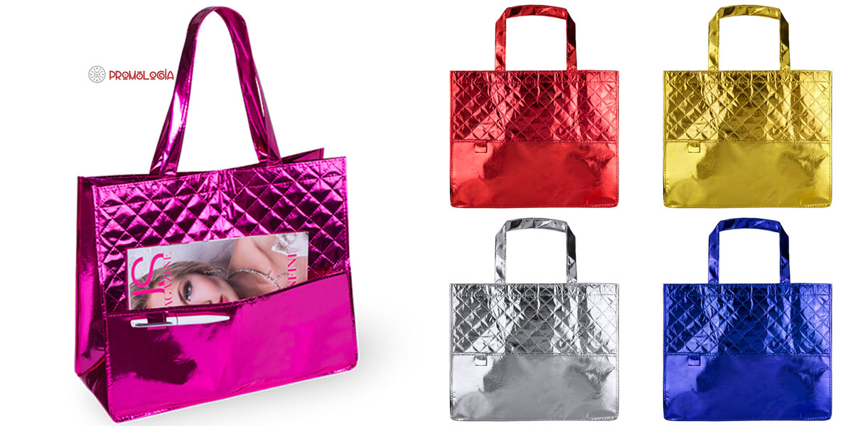 Elegante bolsa de non-woven laminado con bolsillo exterior y porta-bolígrafo. Colores metalizados. Sus medidas son 40 x 33 x 16 cm.