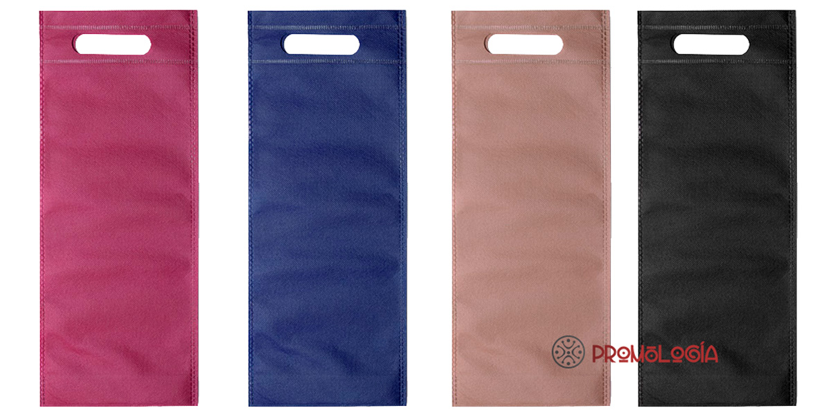 Bolsa promocional de non woven especial para botellas de vino. Se fabrica en 4 colores a elegir. Medidas: 16 x 40 x 6,5 cm | 12 gr. Solo soporta la impresión de una tinta por cara. En impresiones sobre fondos oscuros se cobrará 0,15 euros por cada color en concepto de doble pasada con secado intermedio.