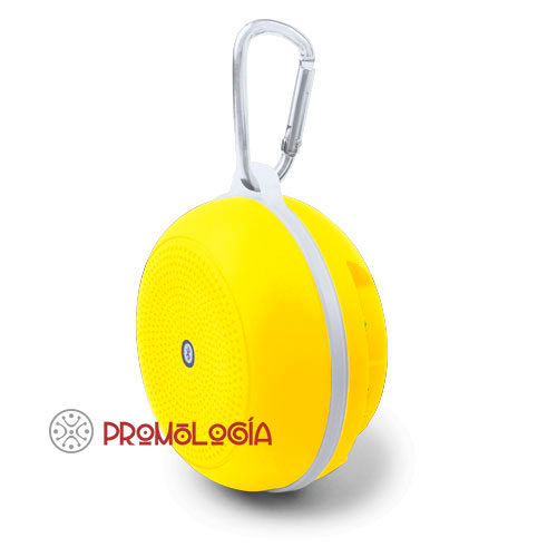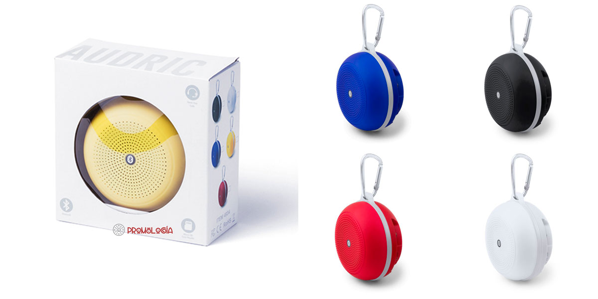 Altavoz con mosquetón para colgar (de la tienda de campaña, mochila, lámpara de mesa,…)  Con conexión Bluetooth, potencia 3W y recargable por USB. Presentación individual y con una gama de 5 colores para elegir. Indicado para promociones de un amplio abanico de sectores, para un target de menores de 40 años.