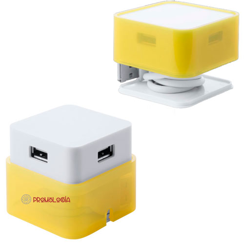 Multi-puerto USB con capacidad para 4 USB’s 2.0. El cable queda recogido dentro de la funda de color cuando no lo esté utilizando. Puede elegir entre 5 colores. Medida: 5,4 x 4 x 5,4 cm.
