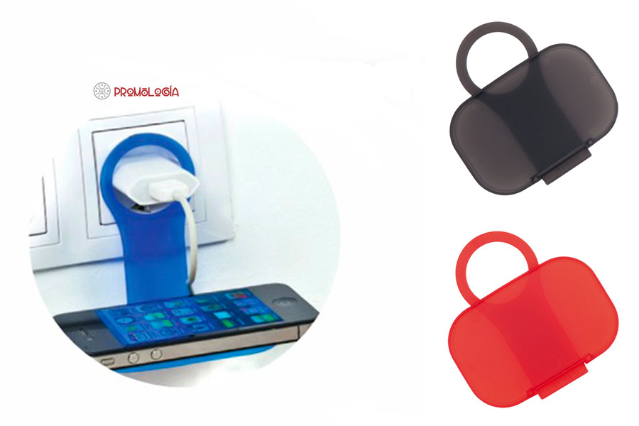 Soporte para cargar el teléfono móvil en un enchufe. ¿No sabe dónde dejar su teléfono móvil cuando está cargando? Con este soporte para smartphone no le hará falta enchufar su cargador cerca de una mesa. Disponible en tres colores. Medidas: 9 x 9,5 x 6 cm.