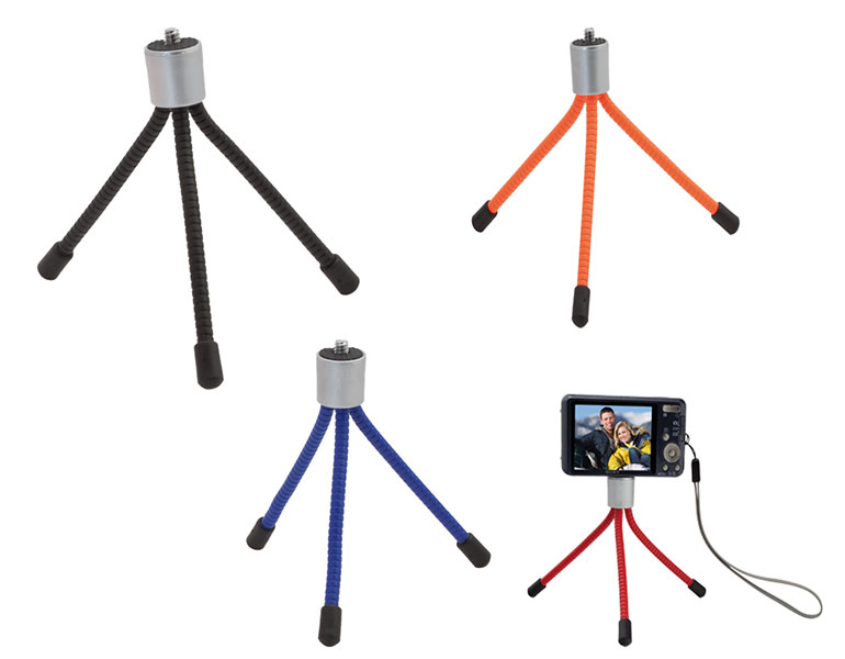 Mini trípode portatil para cámara fotográfica digital. Sus tres patas se pueden doblar para guardarlo con facilidad. También dispone de una pestaña tipo clip en la zona trasera. Disponible en cuatro colores. MEDIDAS: Ø 2 cm. x 12,2 cm.