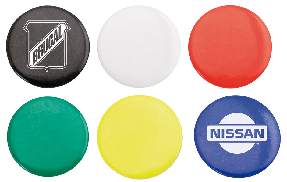Pin promocional muy barato, para imprimir en tampografía. Diversos usos, aunque el más utilizado es como distintivo. Sujeción por mecanismo similar a un imperdible. Diámetro 3 cm.