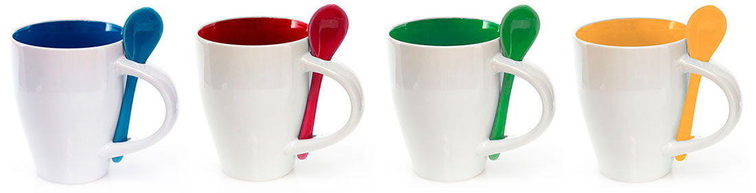 Taza publicitaria con cuchara que se inserta en el asa. Ambas piezas de cerámica. Capacidad de la taza 350 ml. La parte exterior del mug es blanca, y la interior se fabrica en cuatro colores. La cuchara va a juego con el color interior de la taza. Presentación en caja individual.