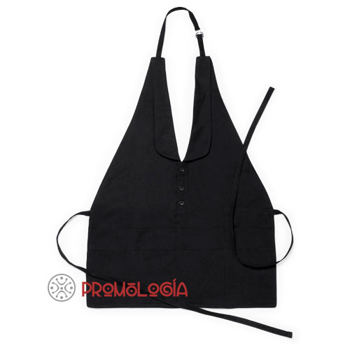 Elegante delantal fabricado 100% en poliéster. Se trata de un delantal de tipo esmoquin de color negro muy recomendable para hostelería. Dispone de múltiples bolsillos donde se pueden introducir multitud de artículos como la libreta, bolígrafo, trapo de cocina, etc. Medidas: 54 x 73 cm.
