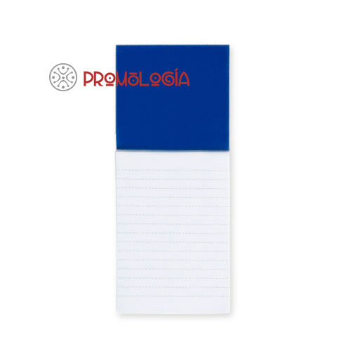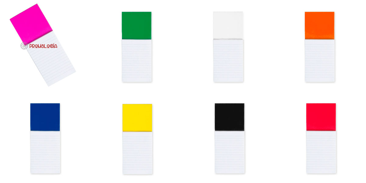 Útil bloc de notas con imán para pegarlo a superficies metálicas como en la nevera. El bloc consta de 40 hojas y se puede elegir hasta en 8 colores diferentes. Serigrafiando su logo y/o datos sus clientes siempre tendrán su contacto a la vista. Medidas: 6 x 14,6 cm.