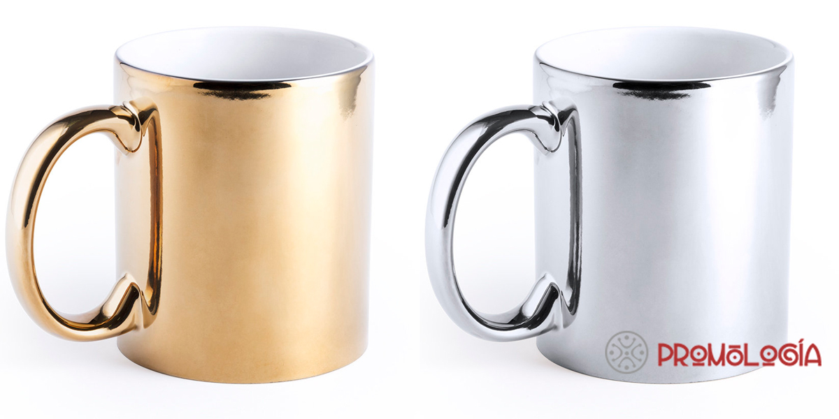 Taza de cerámica de 350ml de capacidad. Disponible en llamativos colores plateado y dorado brillantes. Especialmente diseñada para marcaje en láser y con un recubrimiento exterior especial para que tu publicidad quede perfectamente grabada en color blanco, a juego con el color interior de la taza. Presentada en caja individual. El marcaje se realiza en láser, consultar para serigrafía.