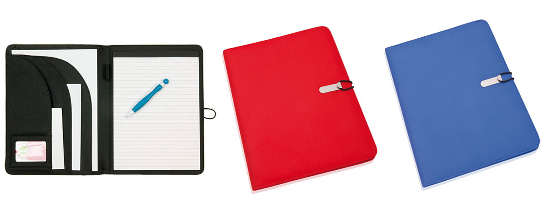 Fabricada en poliéster y microfibra en tres colores diferentes, esta carpeta promocional contiene un bloc de 20 hojas y varios compartimentos delimitados por solapas. Se puede mantener cerrado por una goma. Gran espacio imprimible. Medidas: 24,5 x 32 x 1,5 cm.