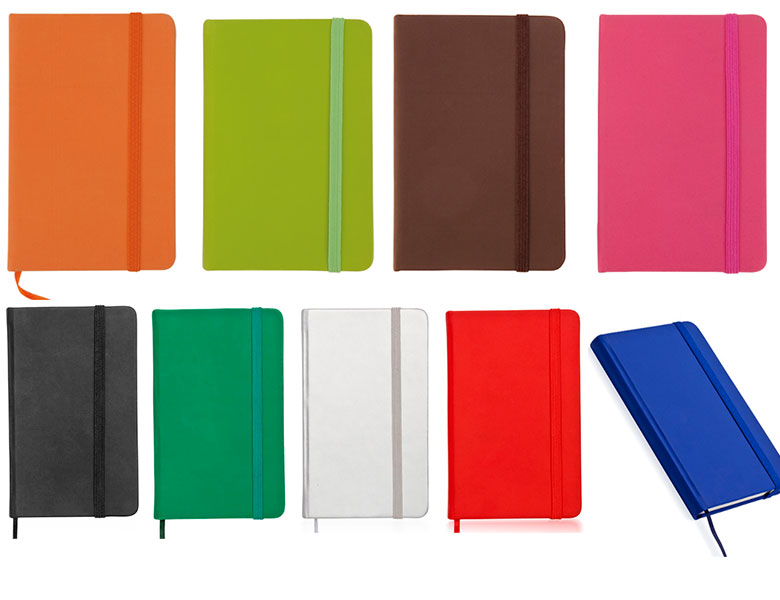 Libreta de notas para impresión de su publicidad en serigrafía, con cubiertas de polipiel en 9 colores diferentes y 100 hojas.