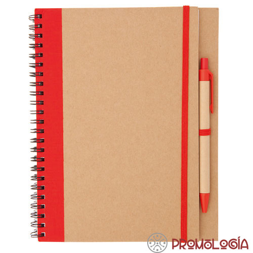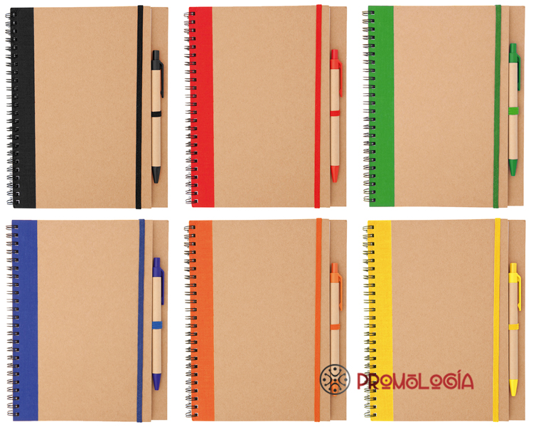 Libreta con bolígrafo, fabricados ambos con cartón reciclado, de 60 hojas. Producto amigable con el medio ambiente, para promociones responsables. Una cinta de goma cierra la libreta y otra sujeta el bolígrafo.