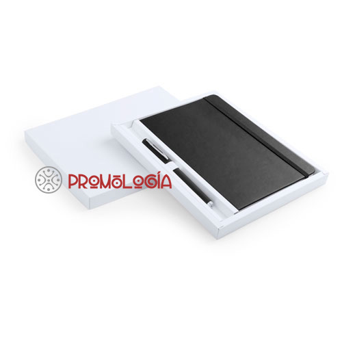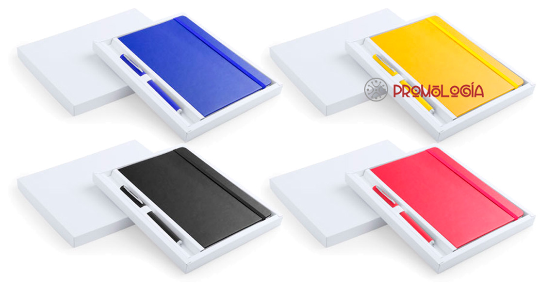 Bloc de notas promocional de 100 hojas fabricado en polipiel con bolígrafo a juego. Disponible en 4 colores a elegir: negro, amarillo, azul y rojo. Con una buena área para impresión en serigrafía, que hará destacar su anuncio publicitario. La impresión se realiza en uno de los artículos, consultar para la impresión en ambos.