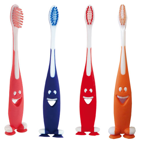Cepillo dental promocional infantil para uso publicitario con forma de divertido muñeco y con dos ventosas en la base para fijarlo derecho después de su uso. Así costará un poco menos acostumbrarse a cepillarse la boca después de cada comida. Disponible en cuatro colores, rosa, azul, naranja y rojo. Muy usado por clínicas dentales fabricantes de dentífricos y otras empresas relacionadas con la salud buco-dental.