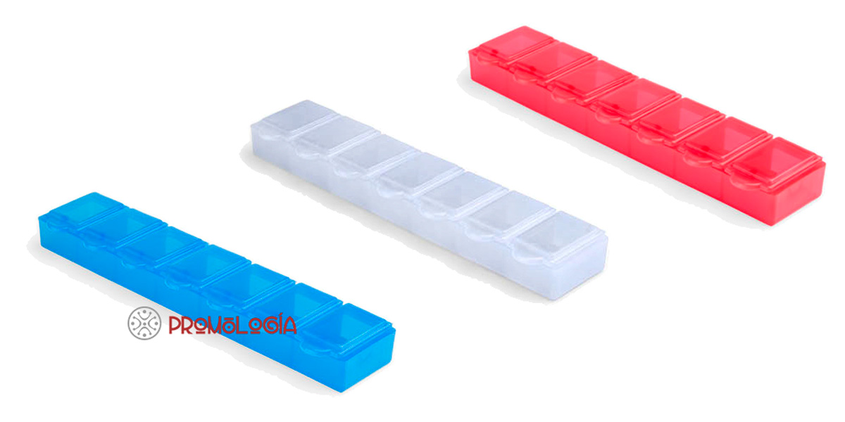 Pastillero de plástico traslúcido con siete compartimentos (uno por cada día de la semana). Disponible en tres colores. Artículo promocional recomendado para farmacias y empresas relacionadas con la salud. Medidas: 14,5 x 1,6 x 3,3 cm