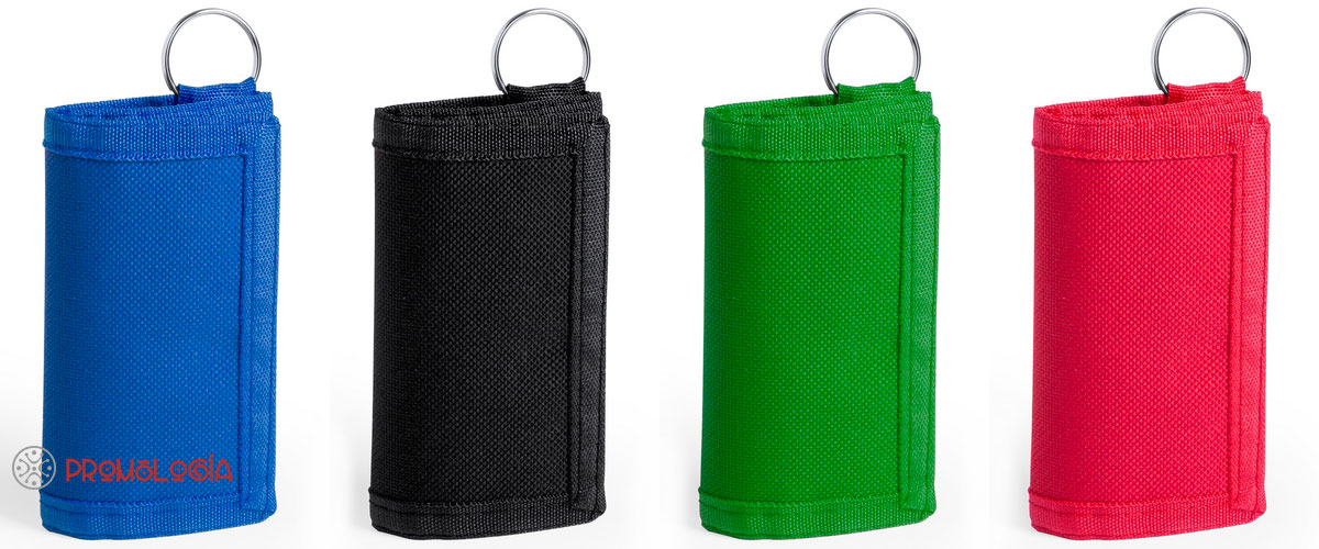 Llavero-monedero fabricado en poliéster 600D, con cremallera interior y cierre de velcro en su parte externa. Cuatro colores a elegir en múltiplos de 10 unidades. Tamaño: 6 x 10,5 x 0,7 cm. Peso: 19 gr. La impresión se realiza en serigrafía.