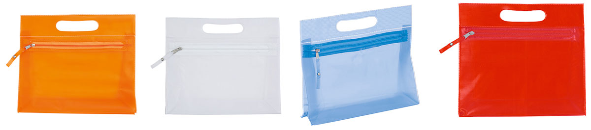 Neceser publicitario fabricado en PVC, tamaño 24 x 21 x 6,5 cm. En cuatro colores translúcidos: naranja, blanco, rojo y azul. Con cremallera y asa. La impresión se realiza en serigrafía. Muy útil en promociones basadas en el hogar y los viajes.