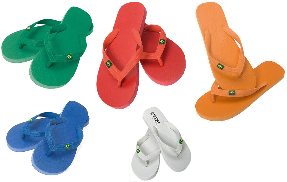 Chanclas promocionales en dos tallas (36-38 y 42-44) y cinco colores (azul, verde, naranja, rojo y blanco), fabricadas con caucho EVA y PVC. Con una pequeña bandera de Brasil en una de las tiras que evocará a la fiesta y el buen tiempo.