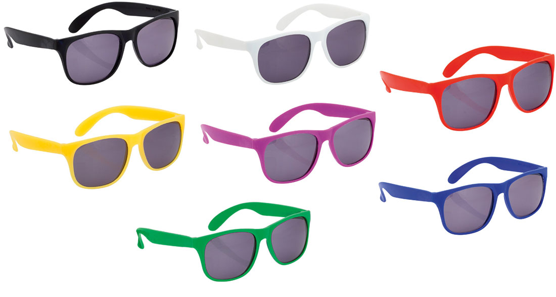 Gafas publicitarias de sol de moderno diseño con protección UV400, de 20 grs. de peso. fabricadas en 7 actuales colores para elegir en múltiplos de 10 unidades: amarillo, blanco, fucsia, azul, verde, negro y rojo. Muy indicadas para campañas veraniegas o dirigidas a un público objetivo joven. La impresión se realiza en tampografía en una de las patillas.