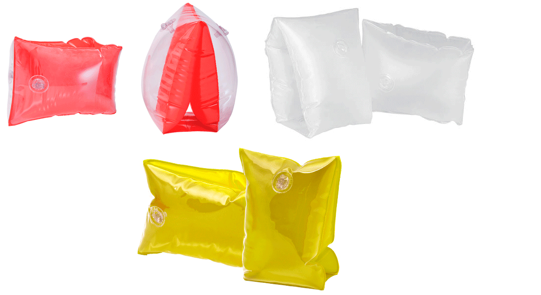Manguitos para piscina y playa de PVC para uso publicitario. Tal vez el mejor sistema para las primeras tomas de contacto con el agua y para ir perdiendo los miedos. La personalización se realiza en serigrafía en ambas piezas. Cuatro colores para escoger. Dimensiones: 22 x 13 cm.