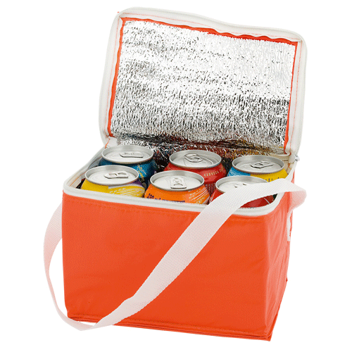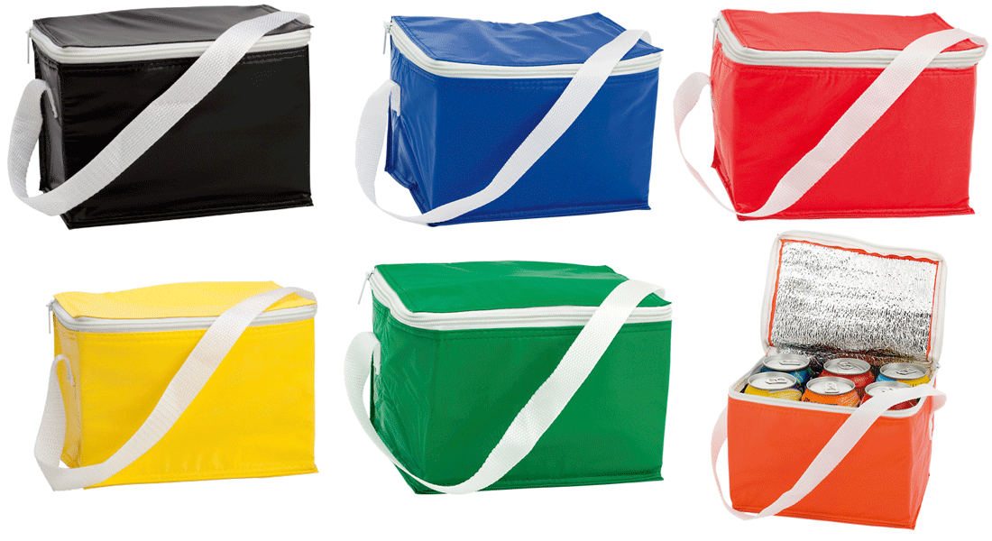 Bolsa isotérmica nevera para 6 latas, para promociones basadas en camping, playa, piscina u otras actividades en el exterior. Fabricada en PVC y aluminio y con cinta para colgar. Las superficies para la impresión en serigrafía son muy amplias.