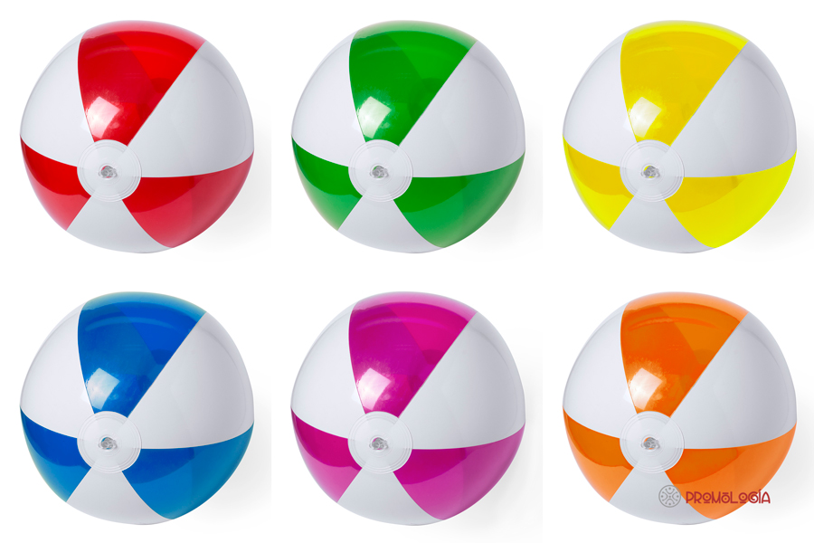 Balón inflable de PVC con diseño bicolor en combinación de paneles blancos y transparentes en vivos colores. Medidas Desinflado: 37 cm. Inflado: 28 cm