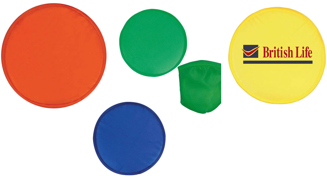 Frisbie plegable fabricado en poliéster, muy económico. Con funda para guardarlo. Es un regalo estupendo relacionado con el ocio del verano. Disponible en cuatro colores.