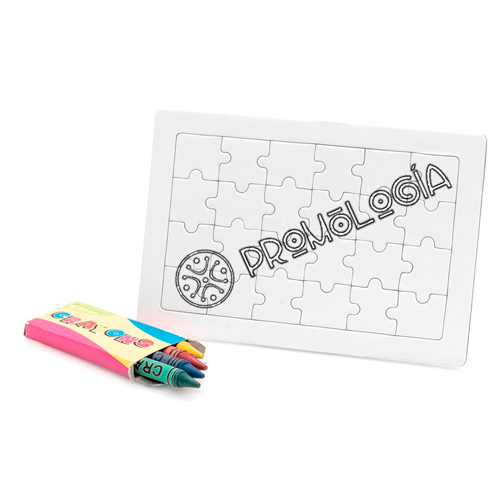 Divertido puzzle de 24 piezas en color blanco. Con caja de 4 ceras en colores amarillo, verde, azul y rojo incluida. 15 x 10 x 0.3 cm
