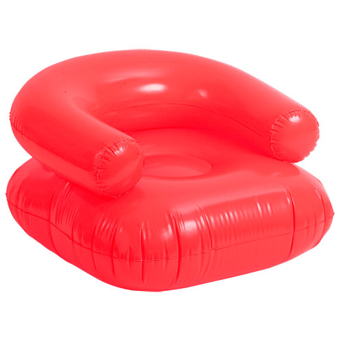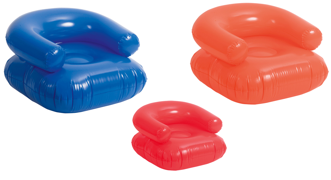 Sillón inflable promocional de PVC de excepcional precio. Muy útil para la piscina, playa (frescor y relax flotando sentado sobre el agua) camping o, simplemente, para un apuro, en nuestra propia casa. Sus medidas son 70 x 45 x 70 cm