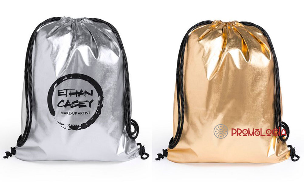 Mochila publicitaria de poliéster 210T, en 2 colores metalizados. Amplio espacio para marcaje en serigrafía. Medidas y peso: 34 x 42  cm., 40 gr. Sus colores metalizados en plata y oro las hacen especialmente indicadas para su uso en fiestas.