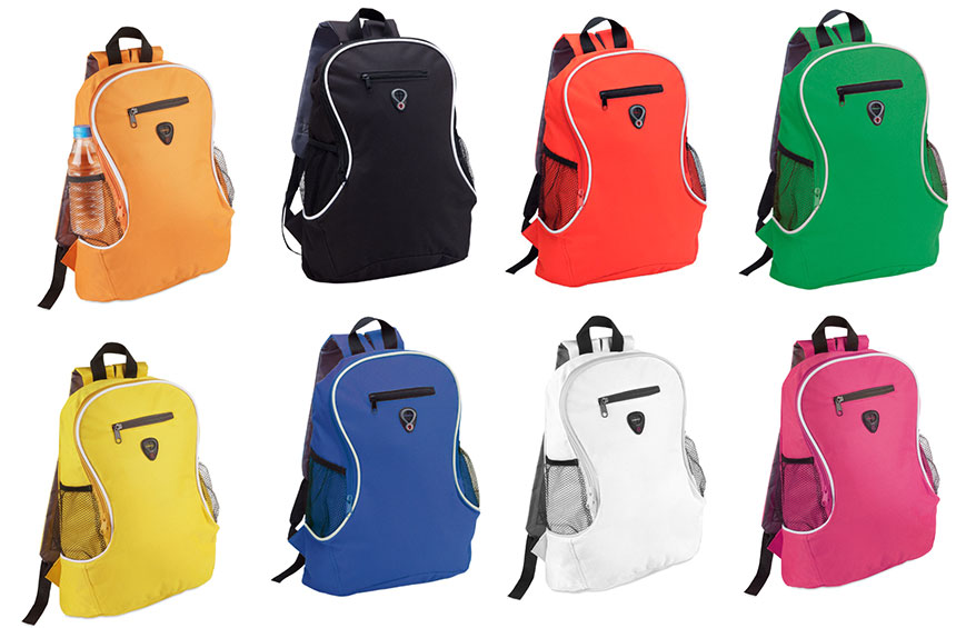 Ocho colores distintos a elegir con esta mochila promocional fabricada con poliéster 600D: amarillo, negro, verde, rojo, naranja, blanco, azul y fucsia. Con bolsillo para dispositivo móvil y salida de auriculares y dos polsillos tipo red en los laterales. Cintas acolchadas y asa superior. Buena zona para impresión en serigrafía.