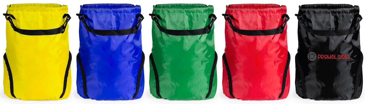 Mochila petate de poliéster 210D, disponible en cinco colores. Con dos compartimentos exteriores con cremalleras, asa para colgar extraíble y cordones para llevarla sobre los hombros. Medidas 30 x 41 x 15,5 cm., peso 120 grs. La personalización se realiza en serigrafía.